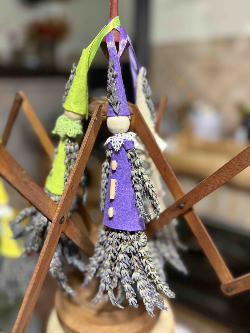 Pupazzetti realizzati interamente a mano con fiori e steli di lavanda e stoffe variopinte